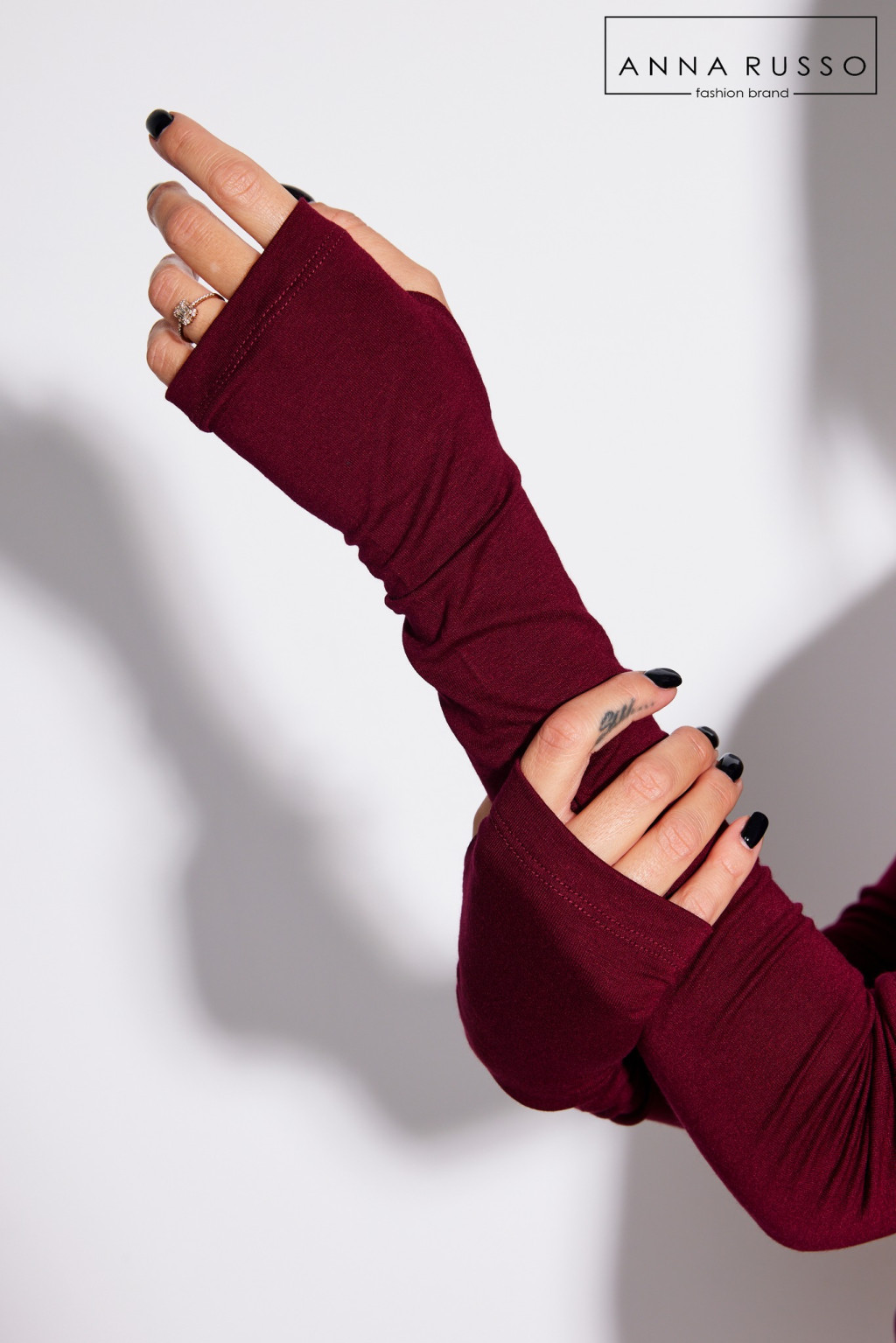 Elasztikus pamutos anyagból készült, kerek nyakú, hosszú ujjú, hüvelyk ujjnál kivágott body.