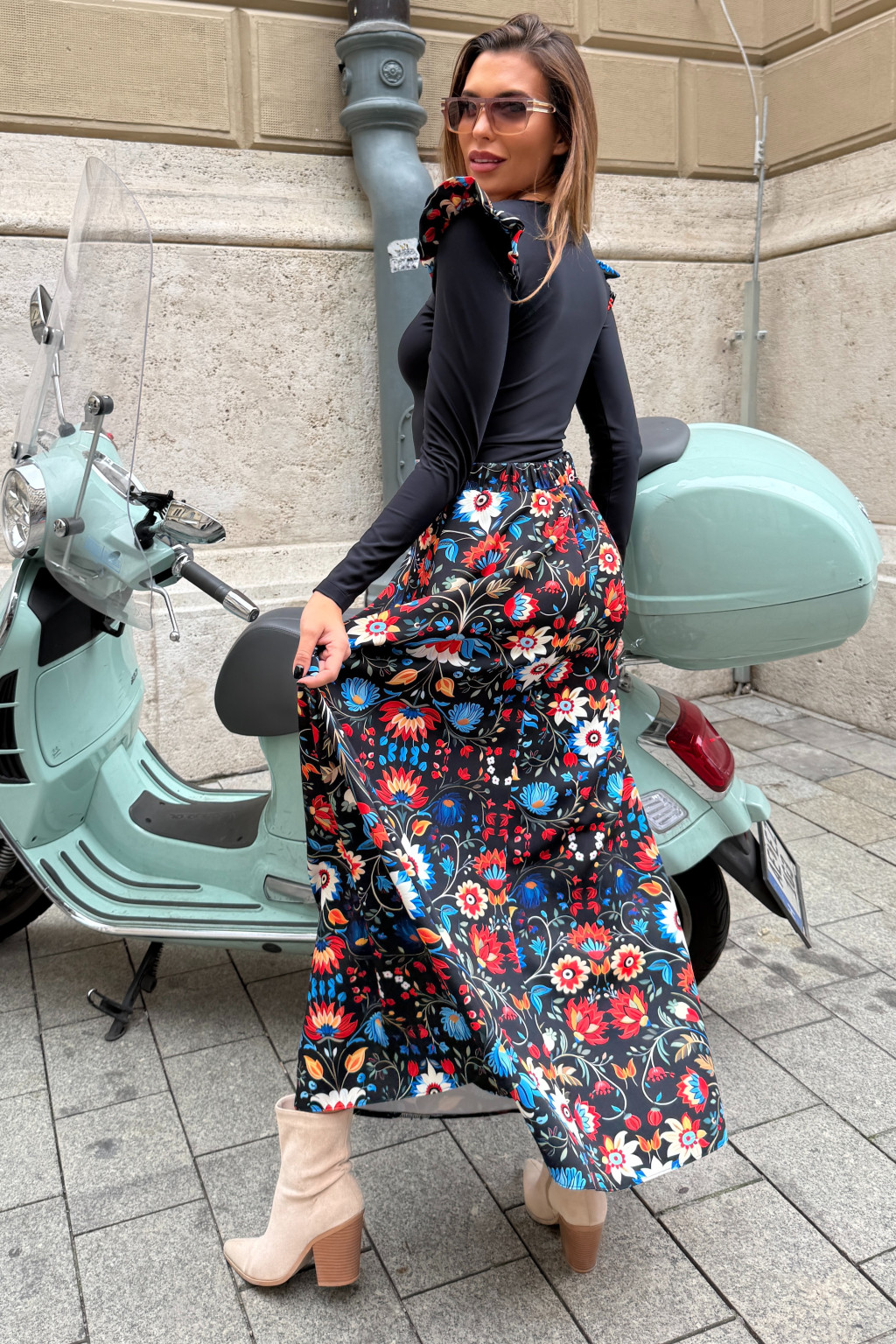 Egyedi mintás Barbie anyagból készült, deréknál gumis, hátul zippes, zsebes maxiszkonya.