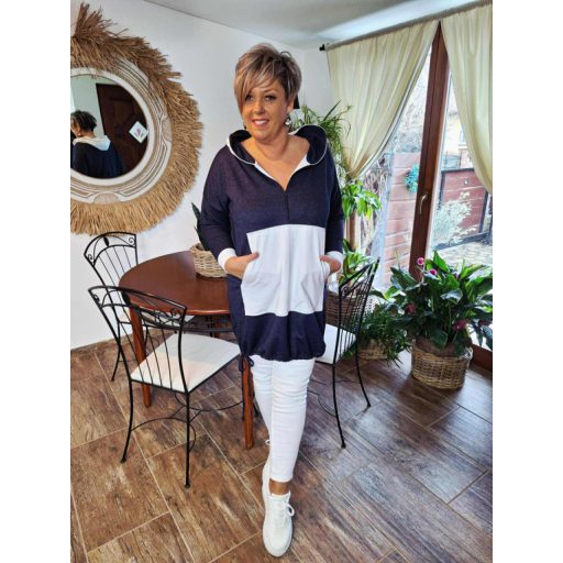 Ez a stílusos és rendkívül kényelmes pulcsiruha a hétköznapok kedvence lesz. Farmer hatású anyagból készült, amelyet látványos, színes betétek tesznek különlegessé és modernné.