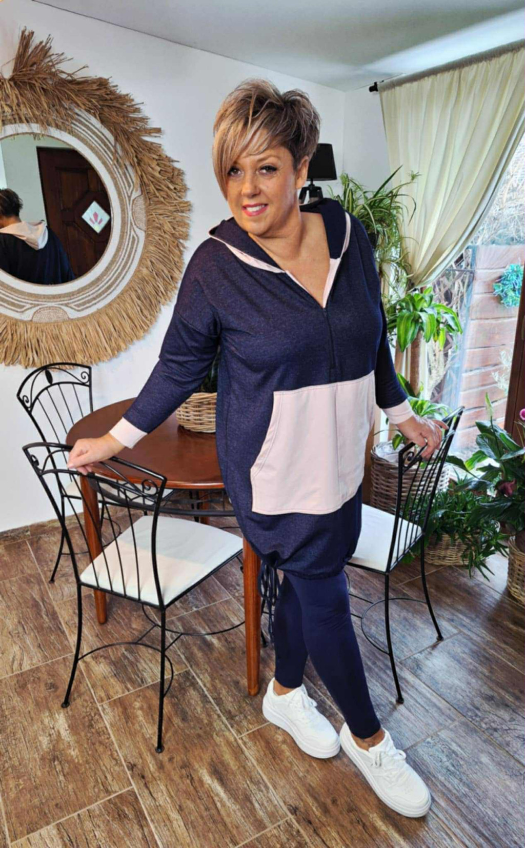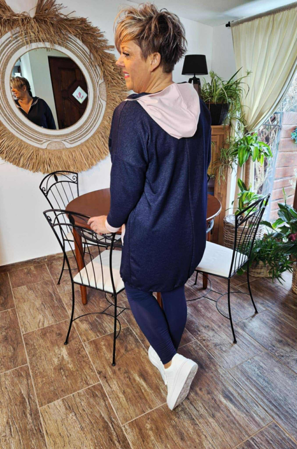 Ez a stílusos és rendkívül kényelmes pulcsiruha a hétköznapok kedvence lesz. Farmer hatású anyagból készült, amelyet látványos, színes betétek tesznek különlegessé és modernné.