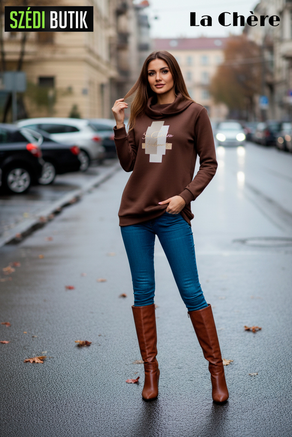 Pamut viszkózból készült, kámzsa nyakú, alul gumival ellátott széles passzéjú pulóver.
