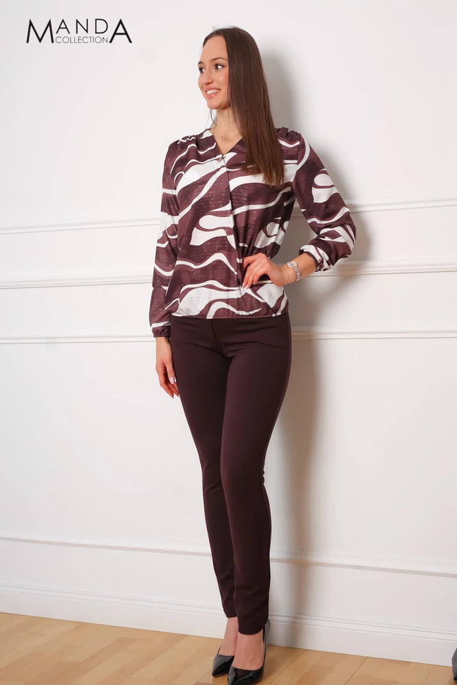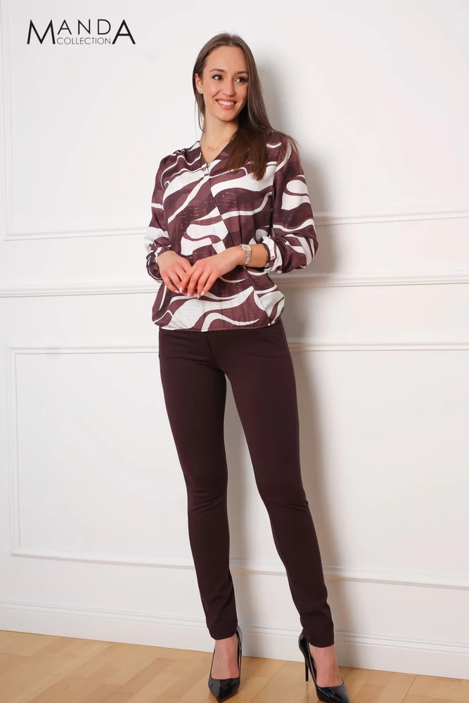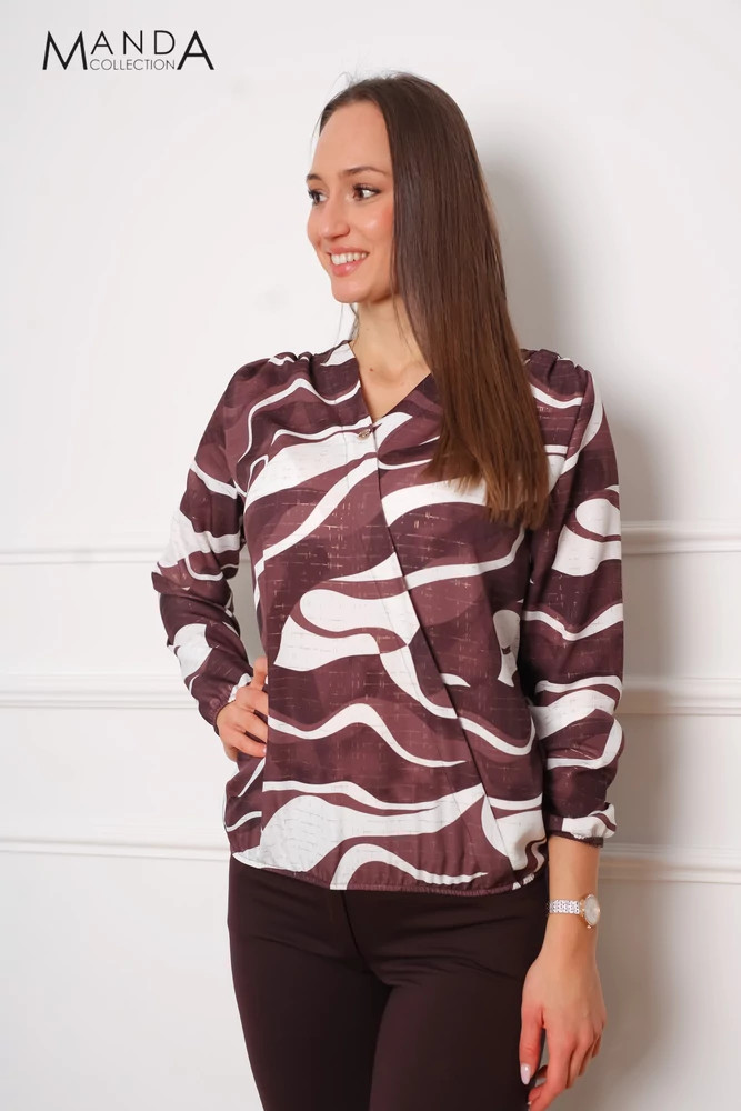 Barna mintás anyagból készült deréknál és ujjánál gumis, vállain ráncolt, bővebb fazonú felső.