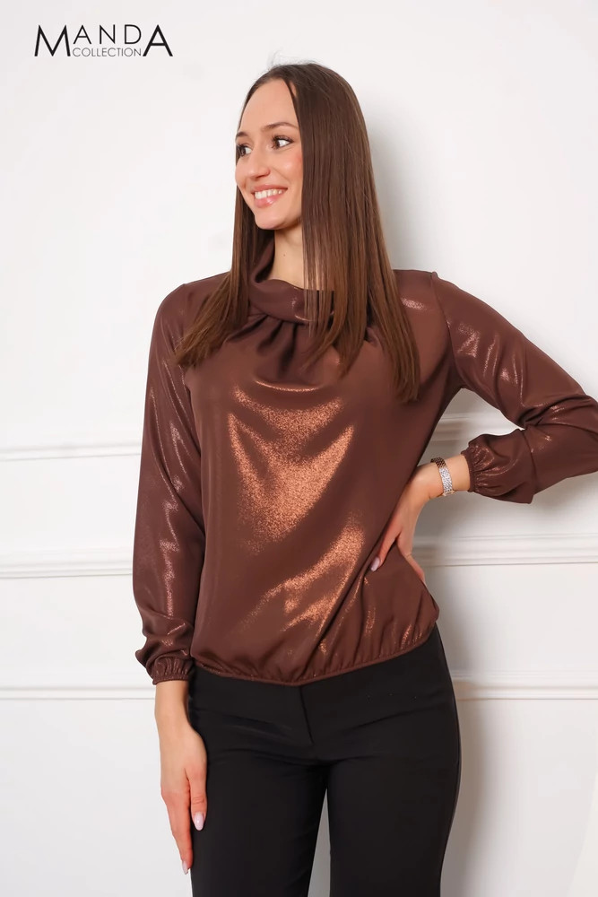 Csillogós anyagból készült kámzsa nyakú, gumis derekú és ujjú, alkalmi felső