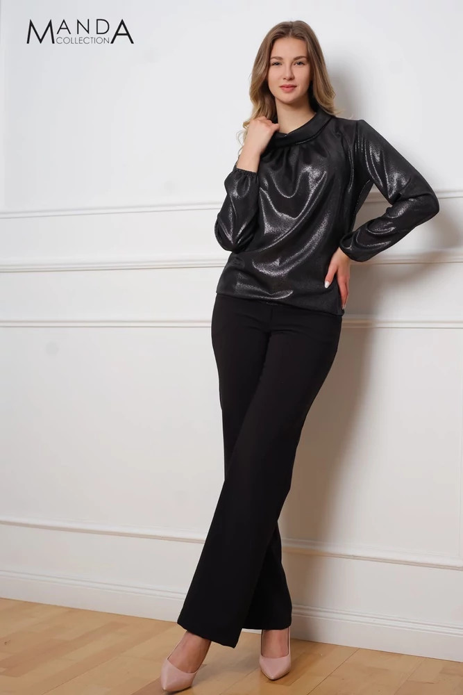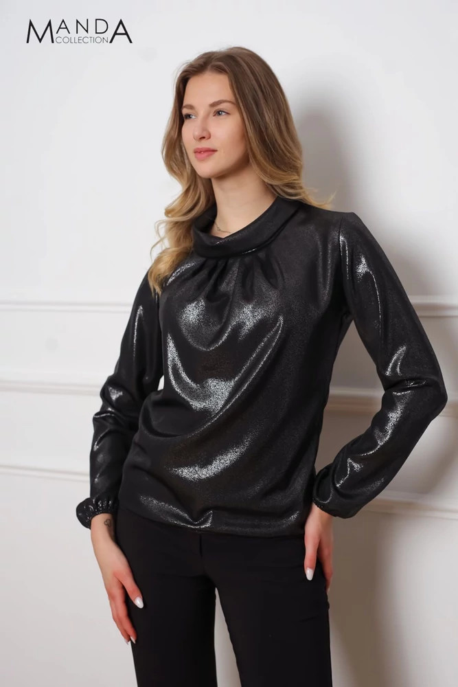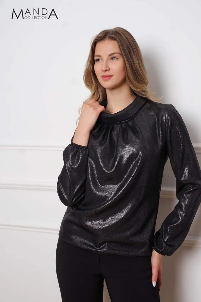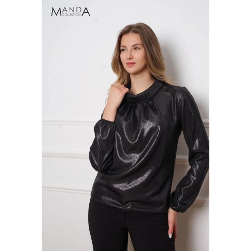 Csillogós anyagból készült kámzsa nyakú, gumis derekú és ujjú, alkalmi felső