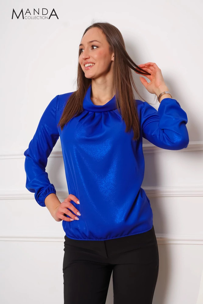Csillogós anyagból készült kámzsa nyakú, gumis derekú és ujjú, alkalmi felső