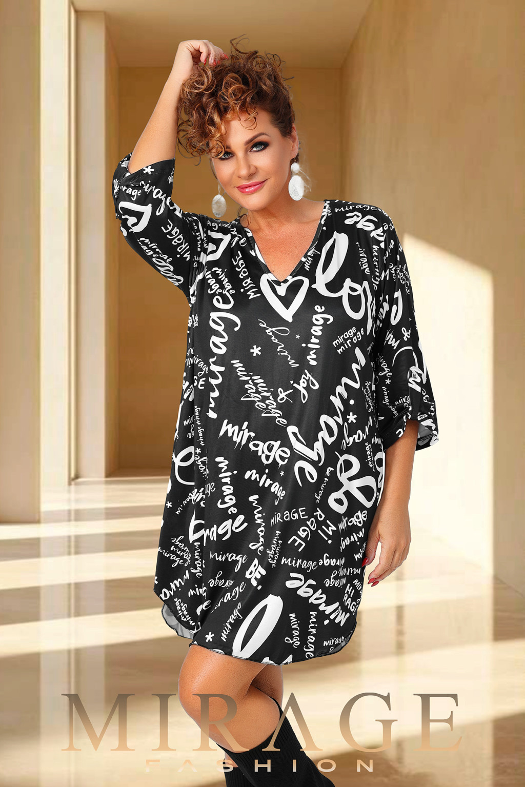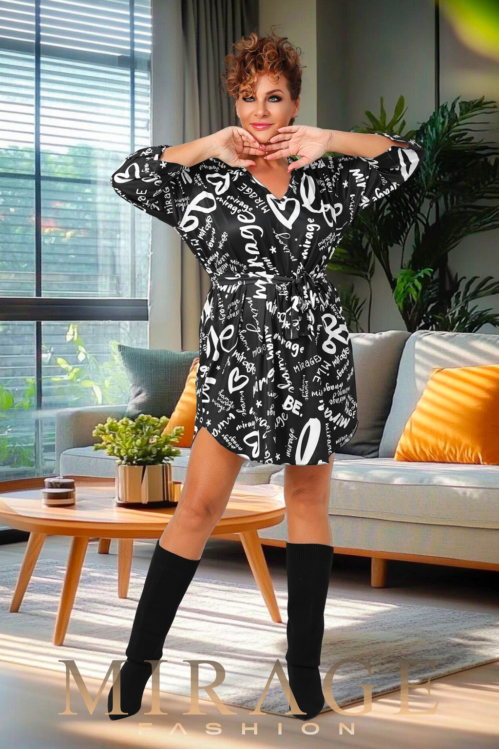 Elől-hátul mintás, öves, V kivágású, bő ujjú ruha.