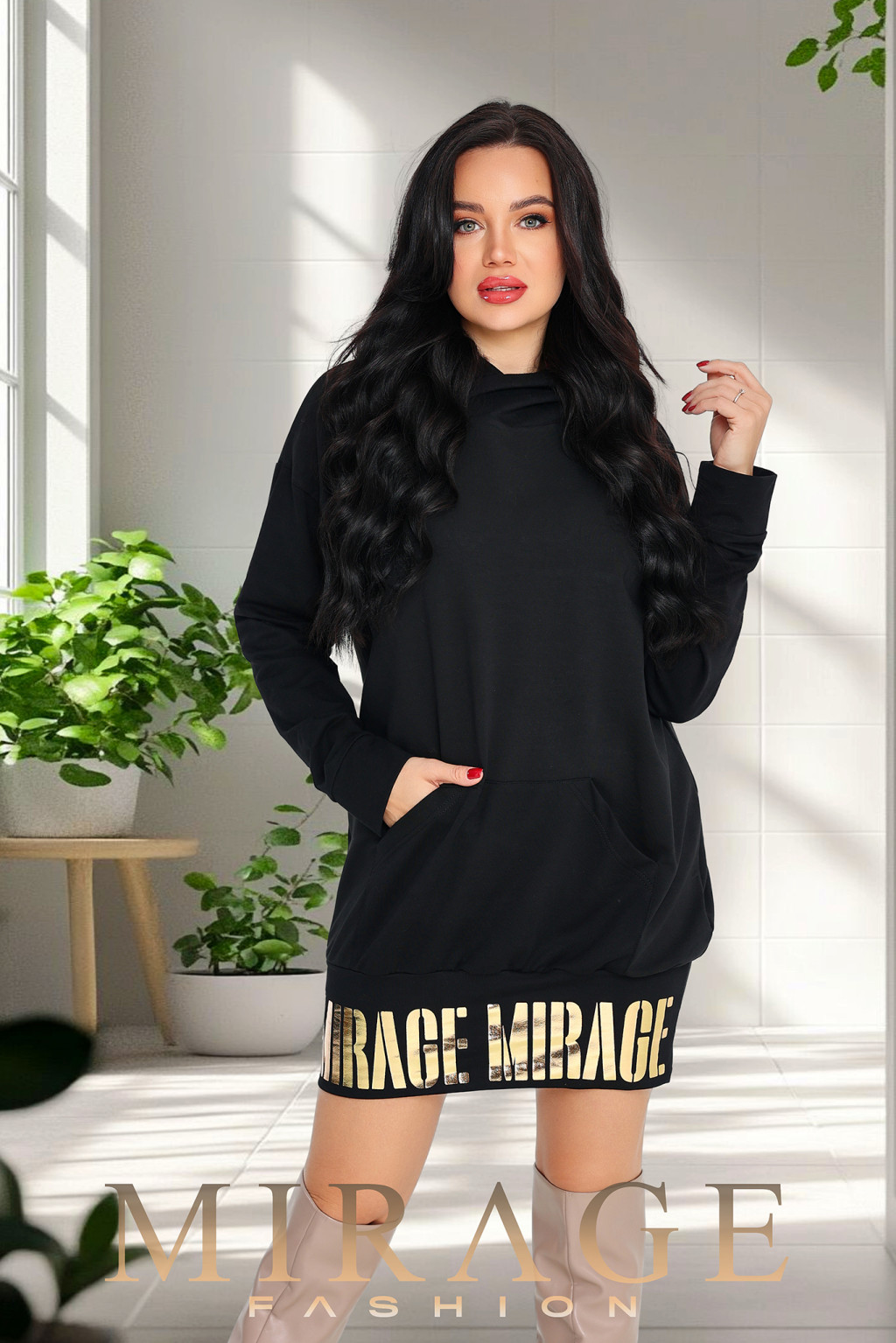 Futter anyagból készült, kapucnis, egyenes fazonú, kenguru zsebes, pulcsi ruha.