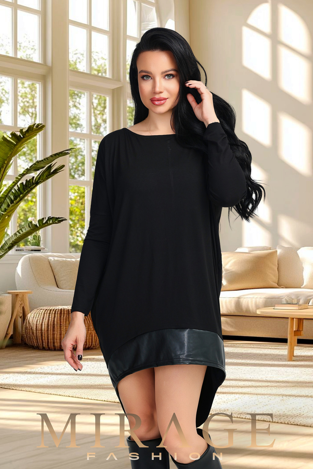 Pamut viszkóz anyagból készült, elől rövidebb, hátul hosszabb fazonú műbőr betétes tunika.