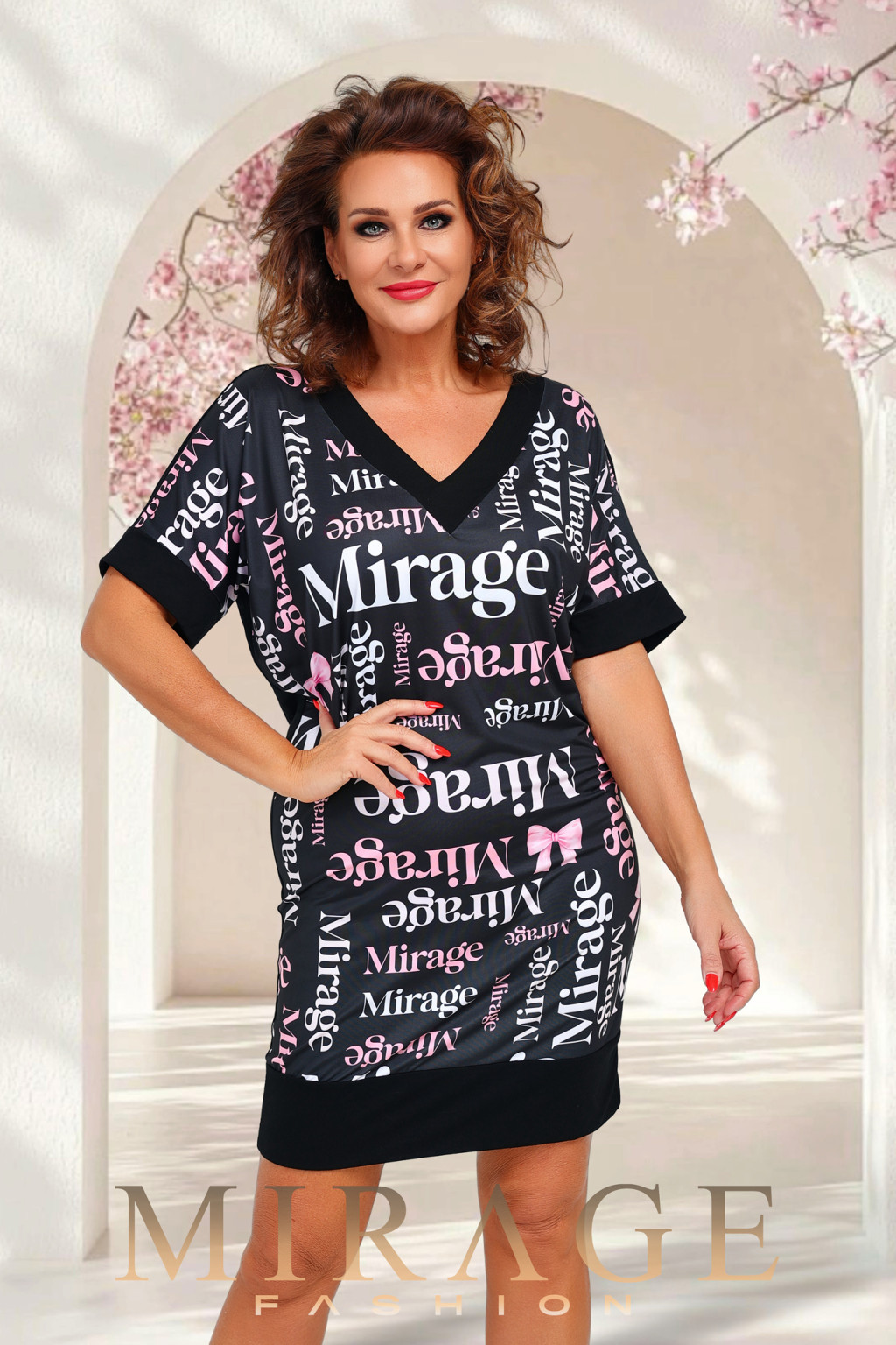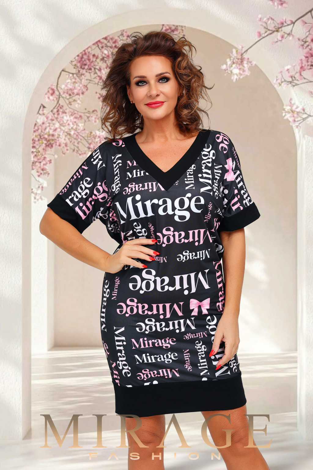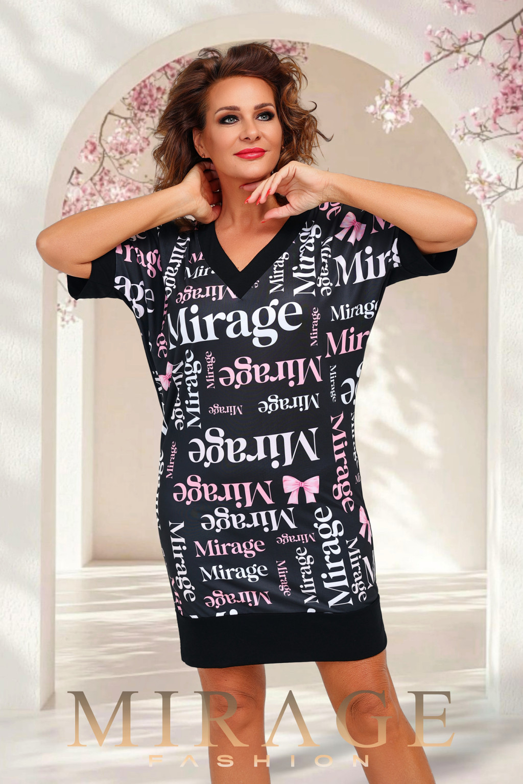 V nyakú, alul nagy passzés, elől mintás mikró, hátul egyszín fekete pamut viszkózból készült ruha.