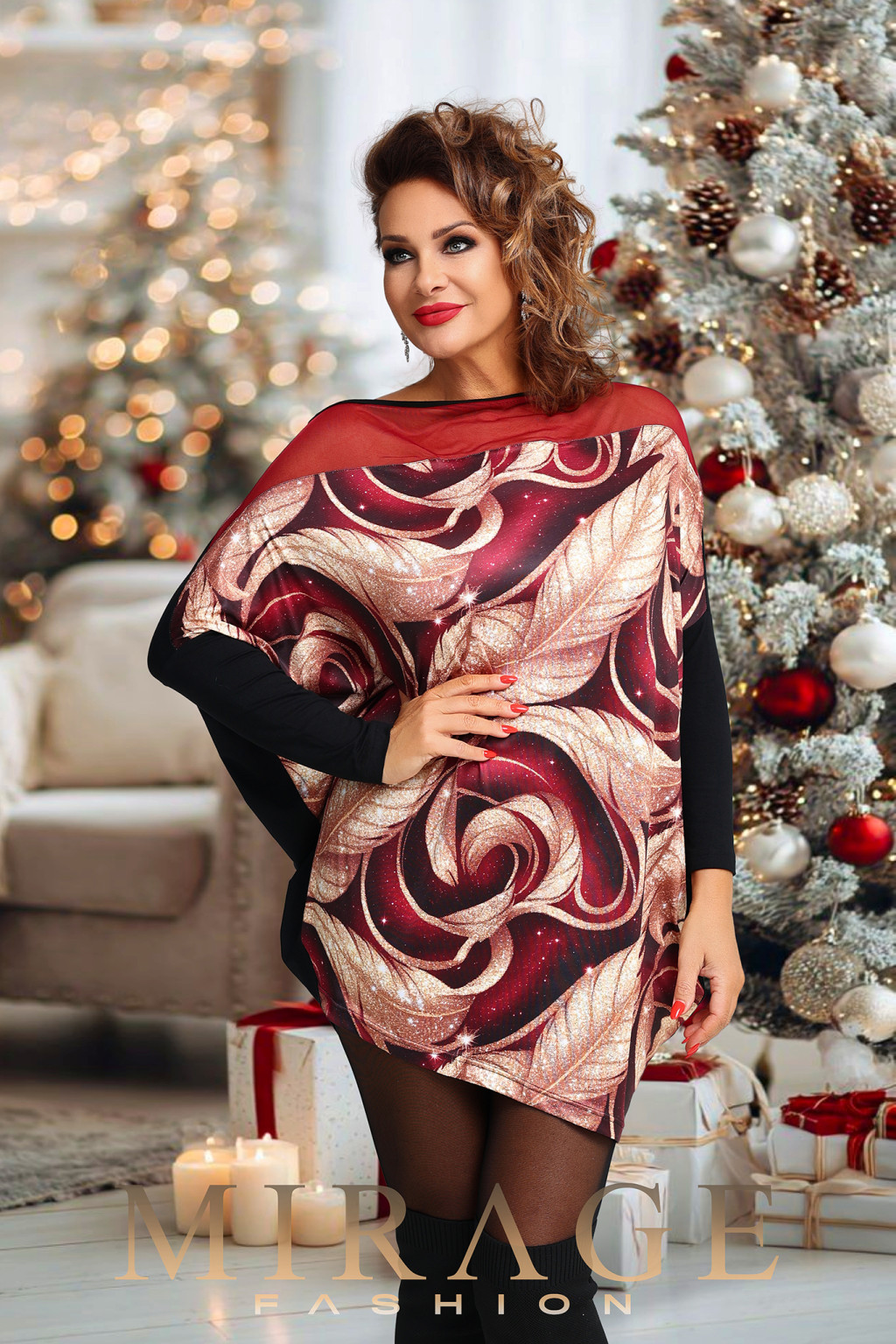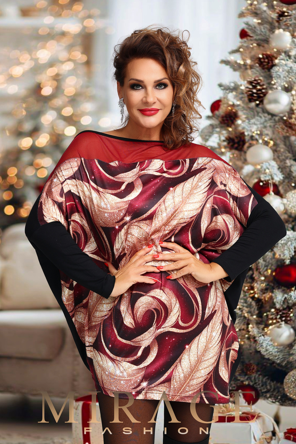 Csónyaknyakú tunika, nyakrésznél neccbetétes. Elől gyönyörű bordó alapon arany mintás, hátul egyszín fekete pamut viszkóz.