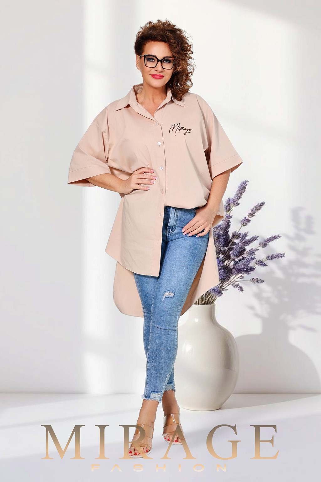 Puplin (ing) anyagból készült elől rövidebb, hátul hosszabb fazonú, galléros nyakú, elől végig gombos ingtunika.