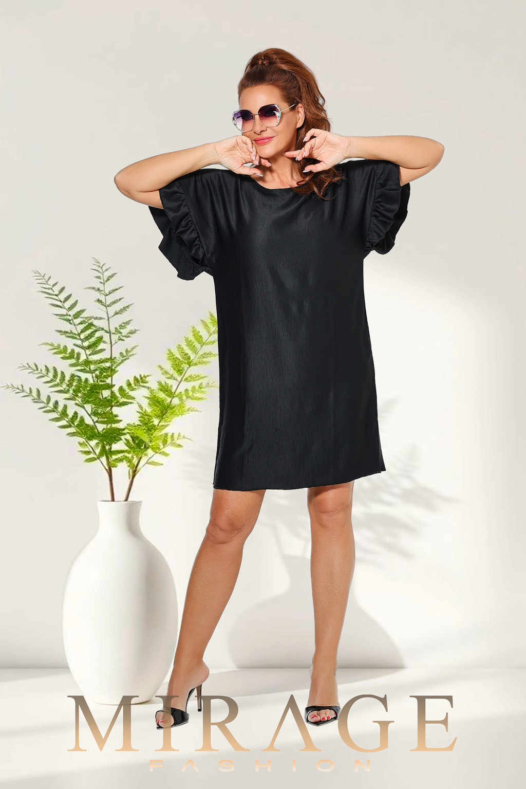 Silky szatén anyagból készült, bő egyenes szabású fodros ujjú, öves ruha.
