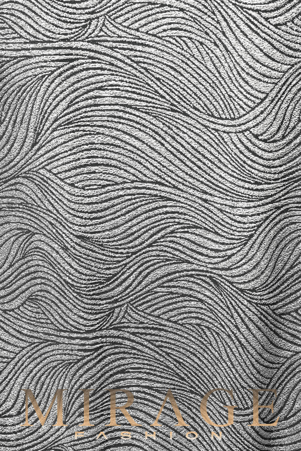Félgarbós nyakú, elől-hátul mintás, ezüstös anyagból készült alkalmi ruha.
