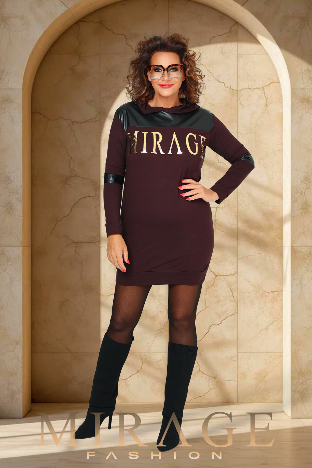 Vastag pamut viszkózból készült, kapucnis, egyenes fazonú, műbőr betétes pulcsi ruha.