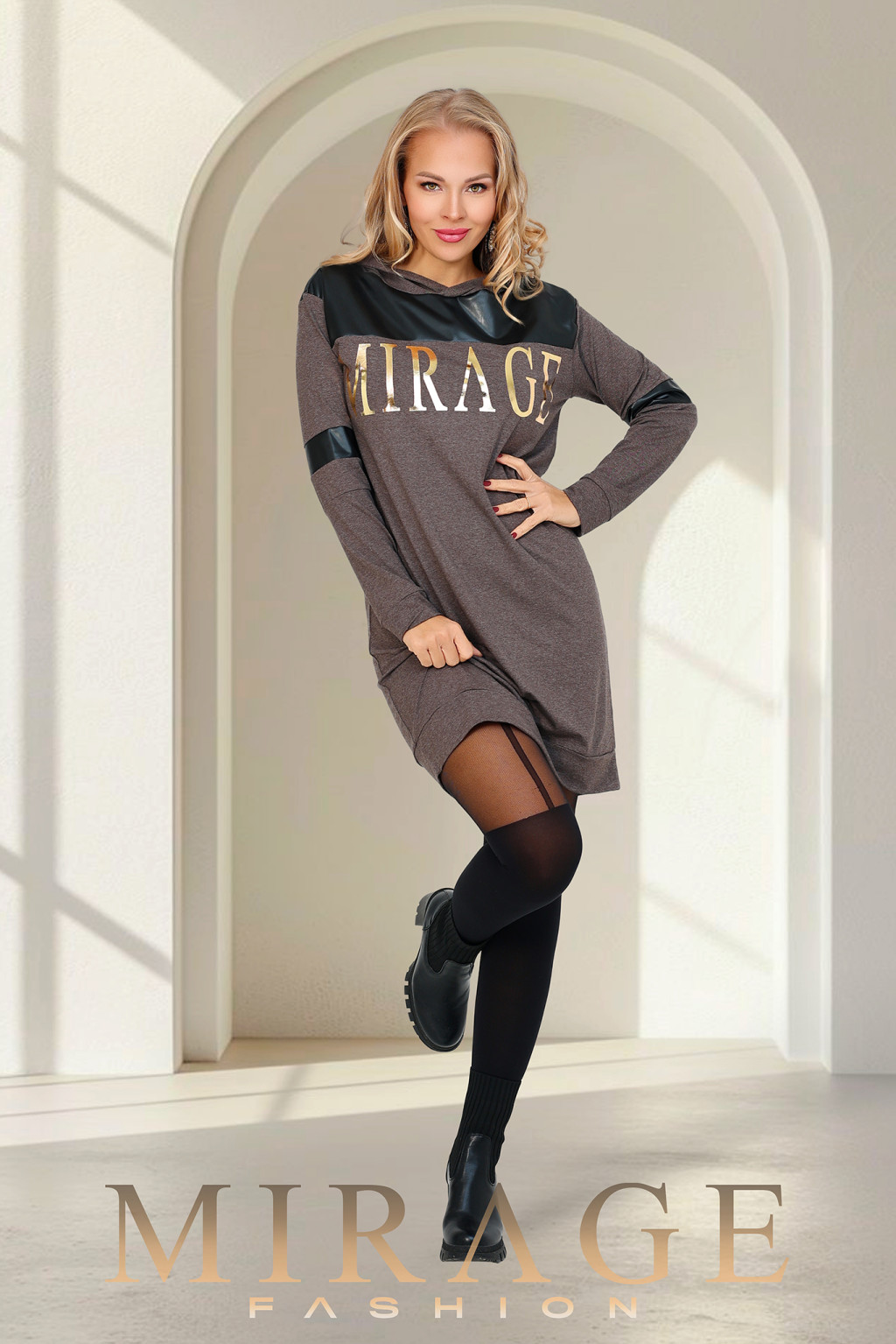 Vastag pamut viszkózból készült, kapucnis, egyenes fazonú, műbőr betétes pulcsi ruha.