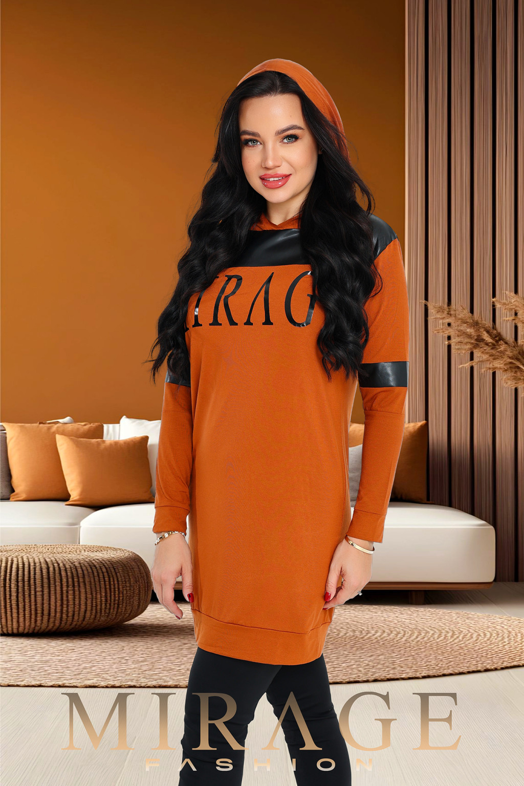 Vastag pamut viszkózból készült, kapucnis, egyenes fazonú, műbőr betétes pulcsi ruha.