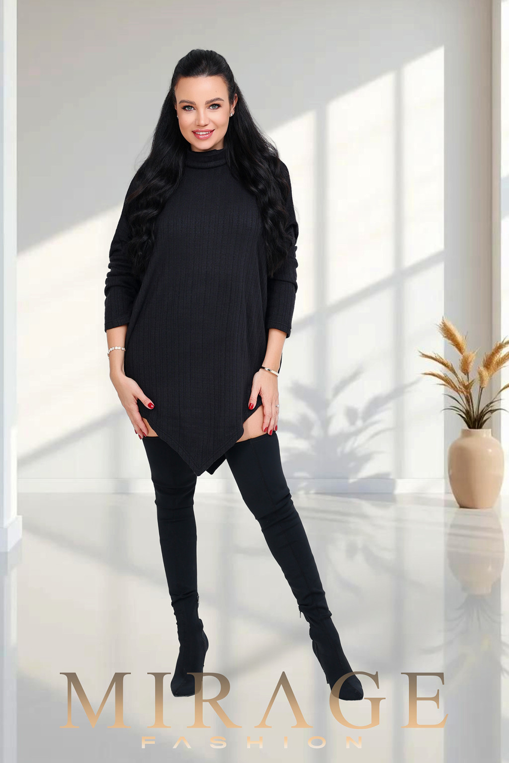 Kötött, bordázott anyagból készült, garbós nyakú, ék aljú pulóver.