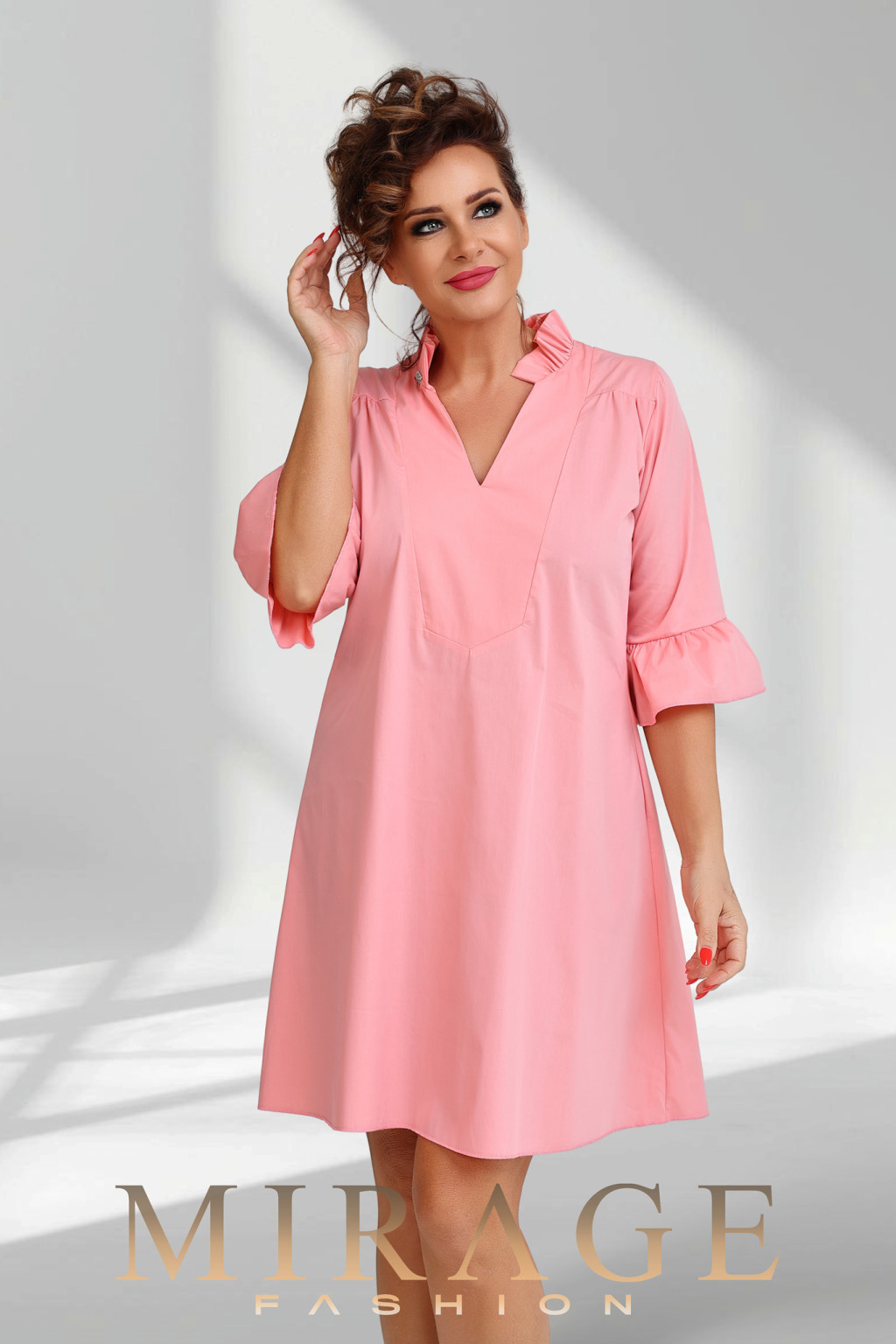 Puplin (ing) anyagból készült V nyakú, fodros ujjú és nyakú, A vonalú ingruha.