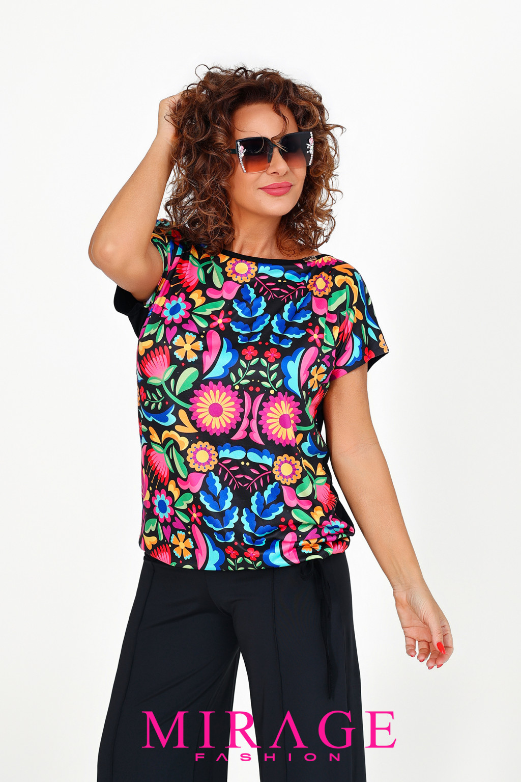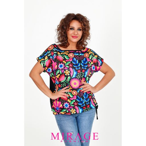 Elől mintás mikró, hátul egyszín pamut viszkóz anyagból készült, kerek nyakú, rövid ujjú, oldalt kötős felső.