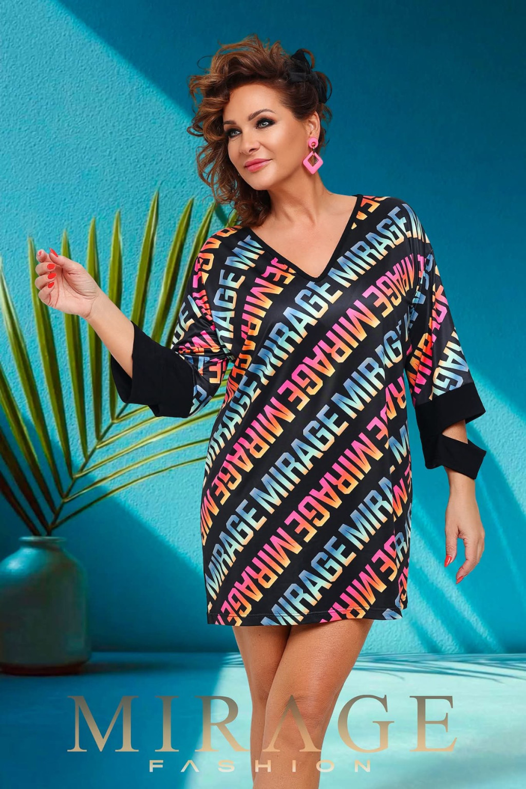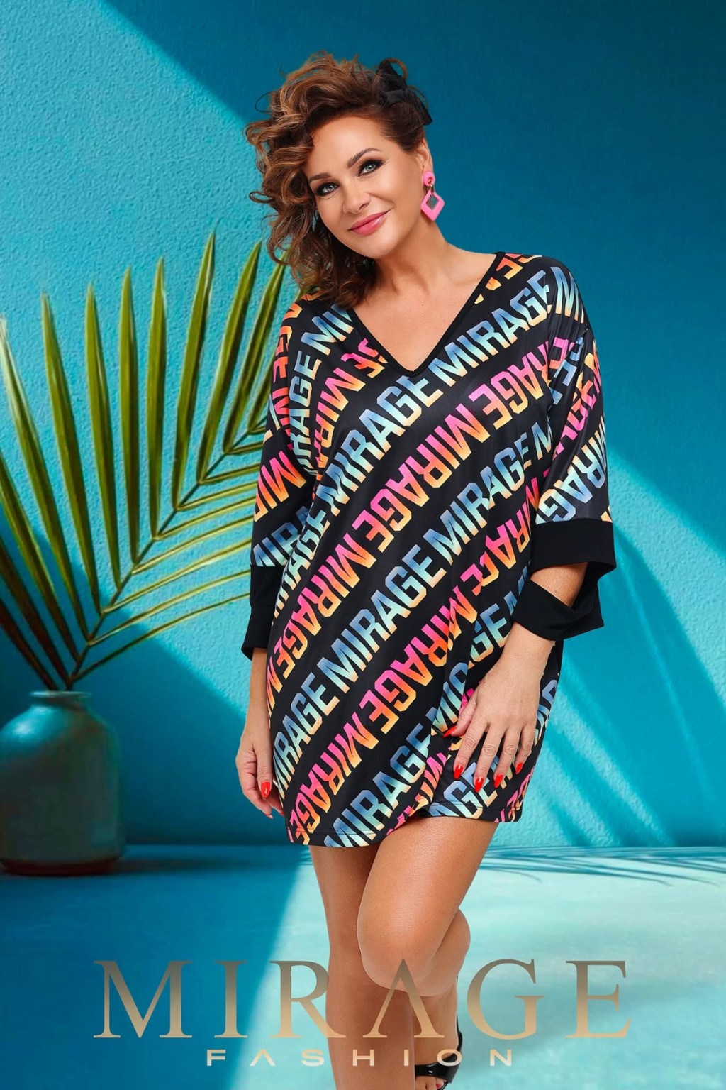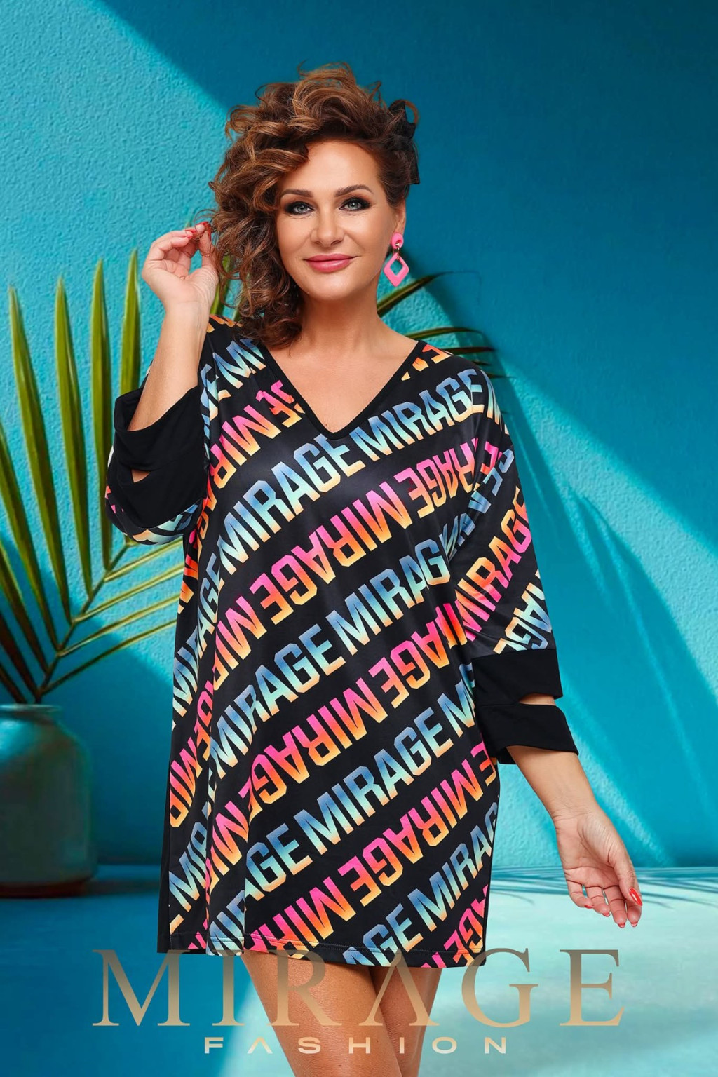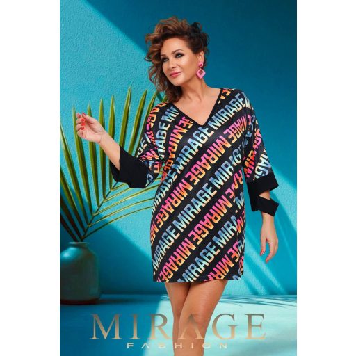 Elől mintás mikró, hátul egyszín fekete pamut viszkóz anyagból készült, V nyakú, vágott ujjú, bő tunika.