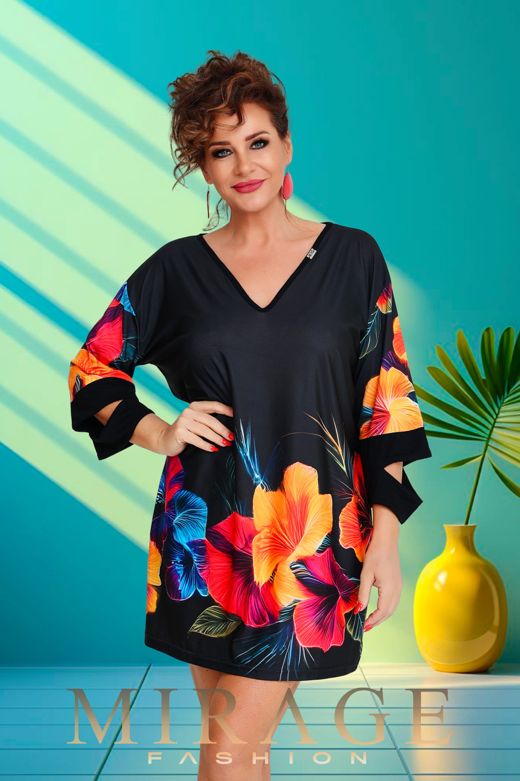 Elől mintás mikró, hátul egyszín fekete pamut viszkóz anyagból készült, V nyakú, vágott ujjú, bő tunika.