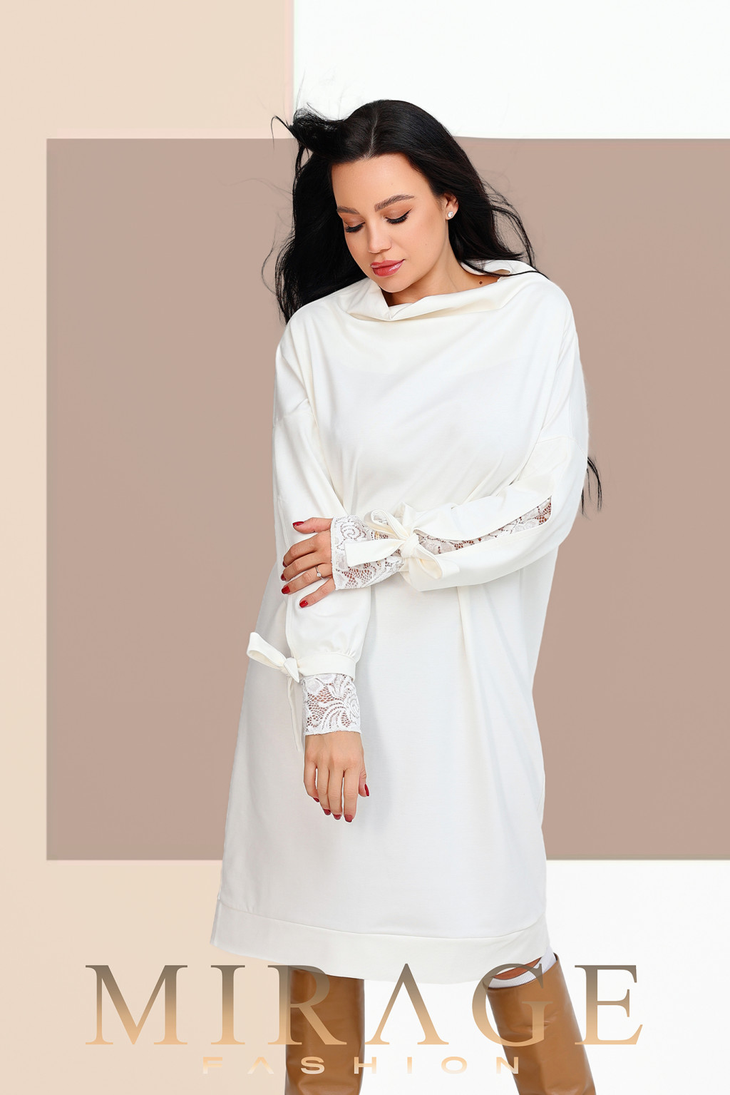 Kámzsa nyakú, ujján csipkebetés és szalagos pulóver.