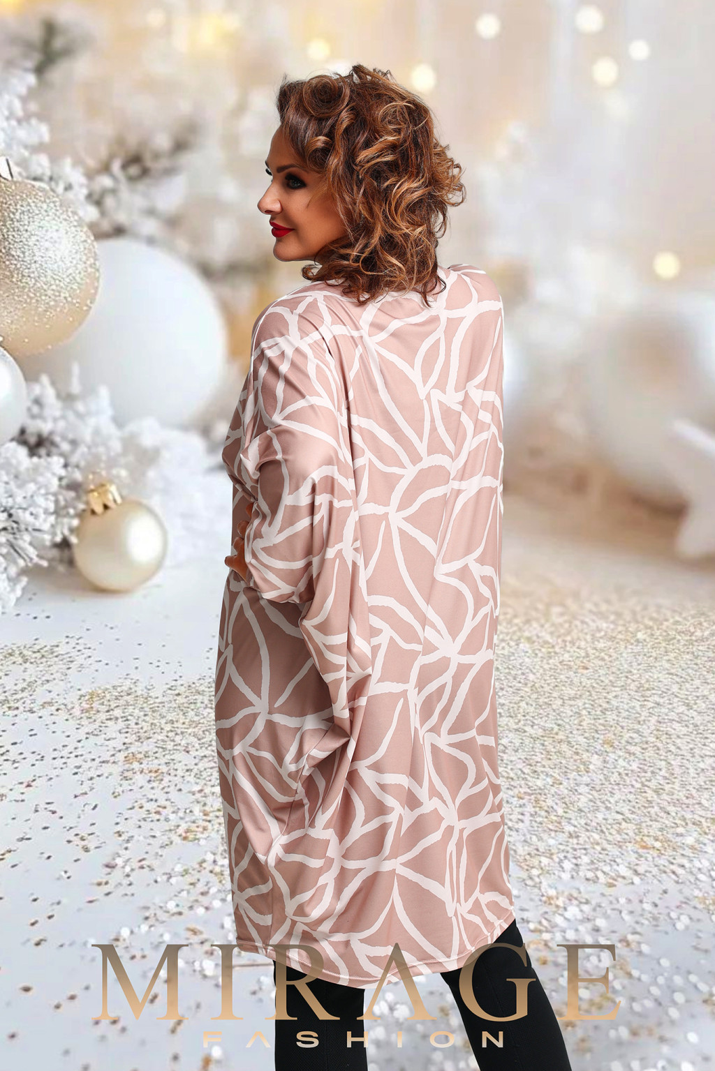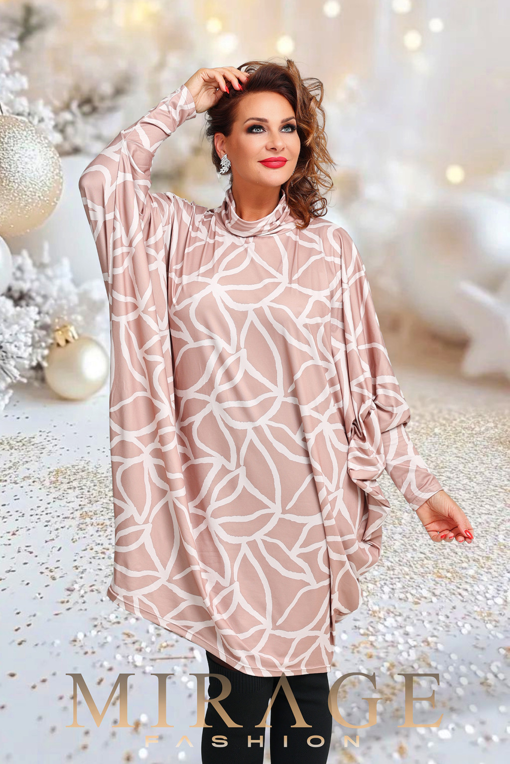 Mintás anyagból készült, garbós nyakú, denevér ujjú bő ruha.