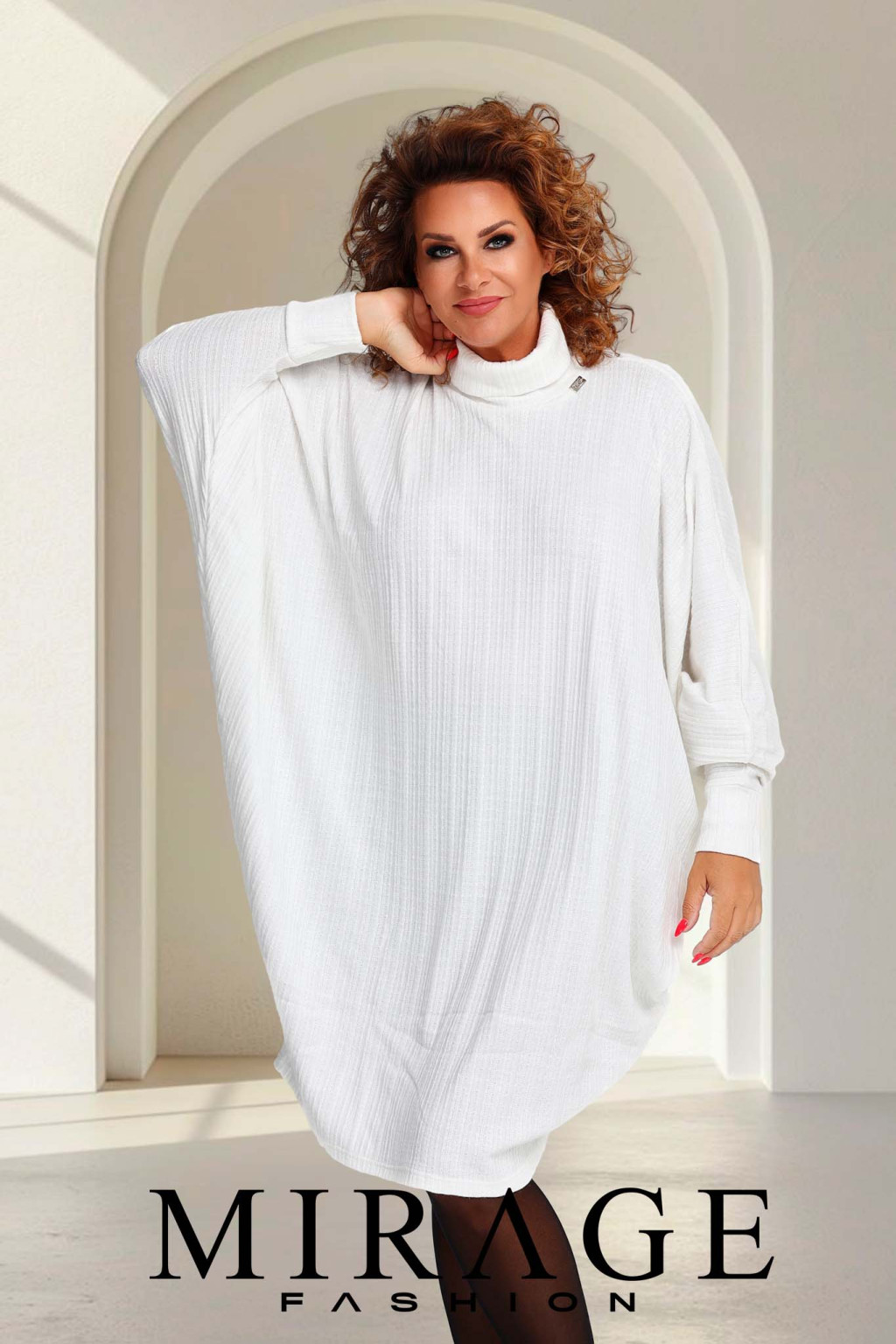 Vastag bordázott, kötött anyagból készült, garbós nyakú, denevér ujjú bő ruha.