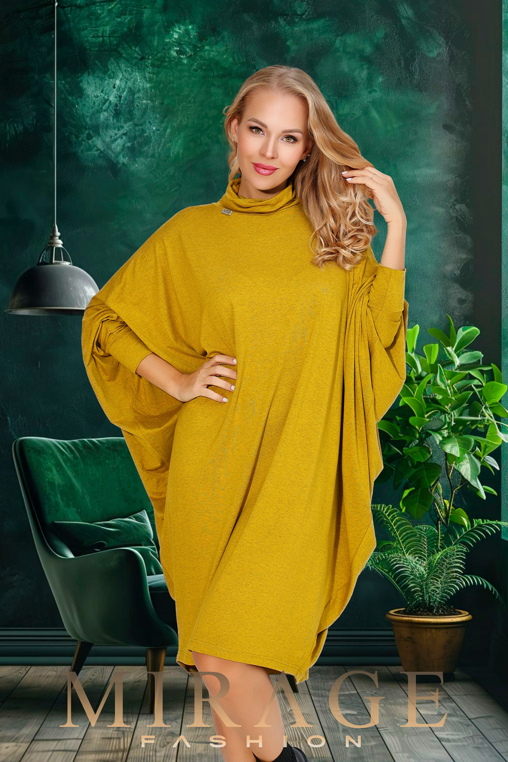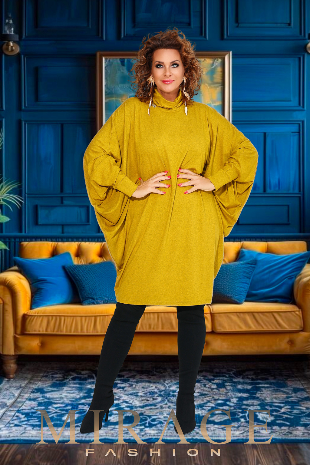 Vastag pamut anyagból készült, garbós nyakú, denevér ujjú bő ruha.