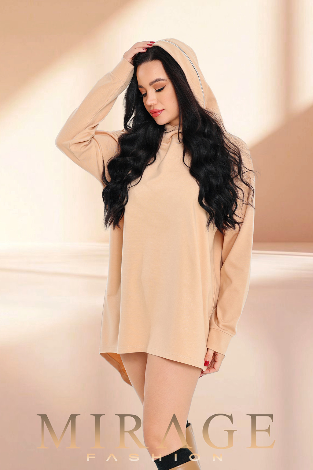 Vastag puntó anyagból készült, kámzsa nyakú (zippes), egyenes fazonú pulcsi ruha.