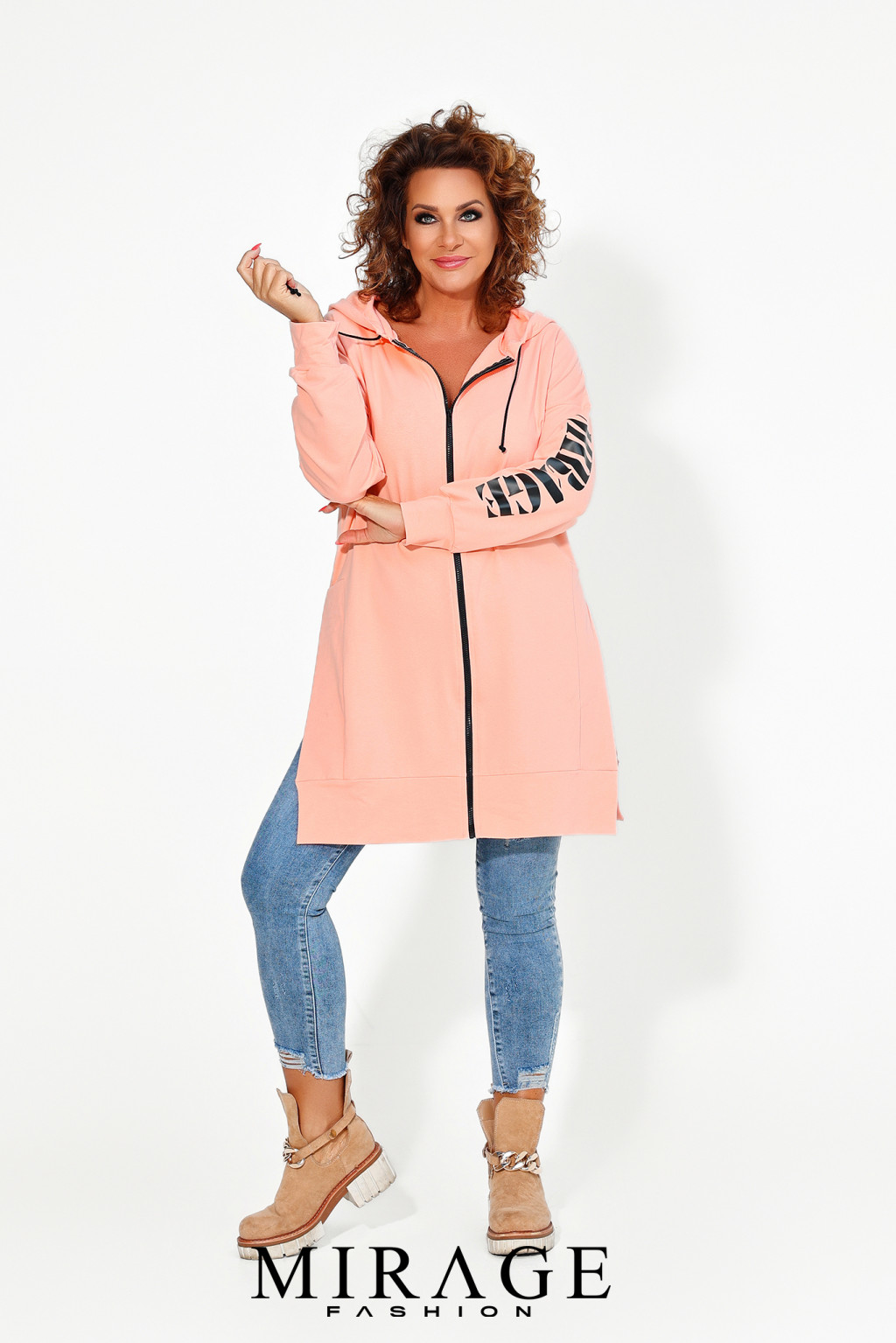 Két oldalán felvágott, kapucnis, elől végig zippes kardigán.
