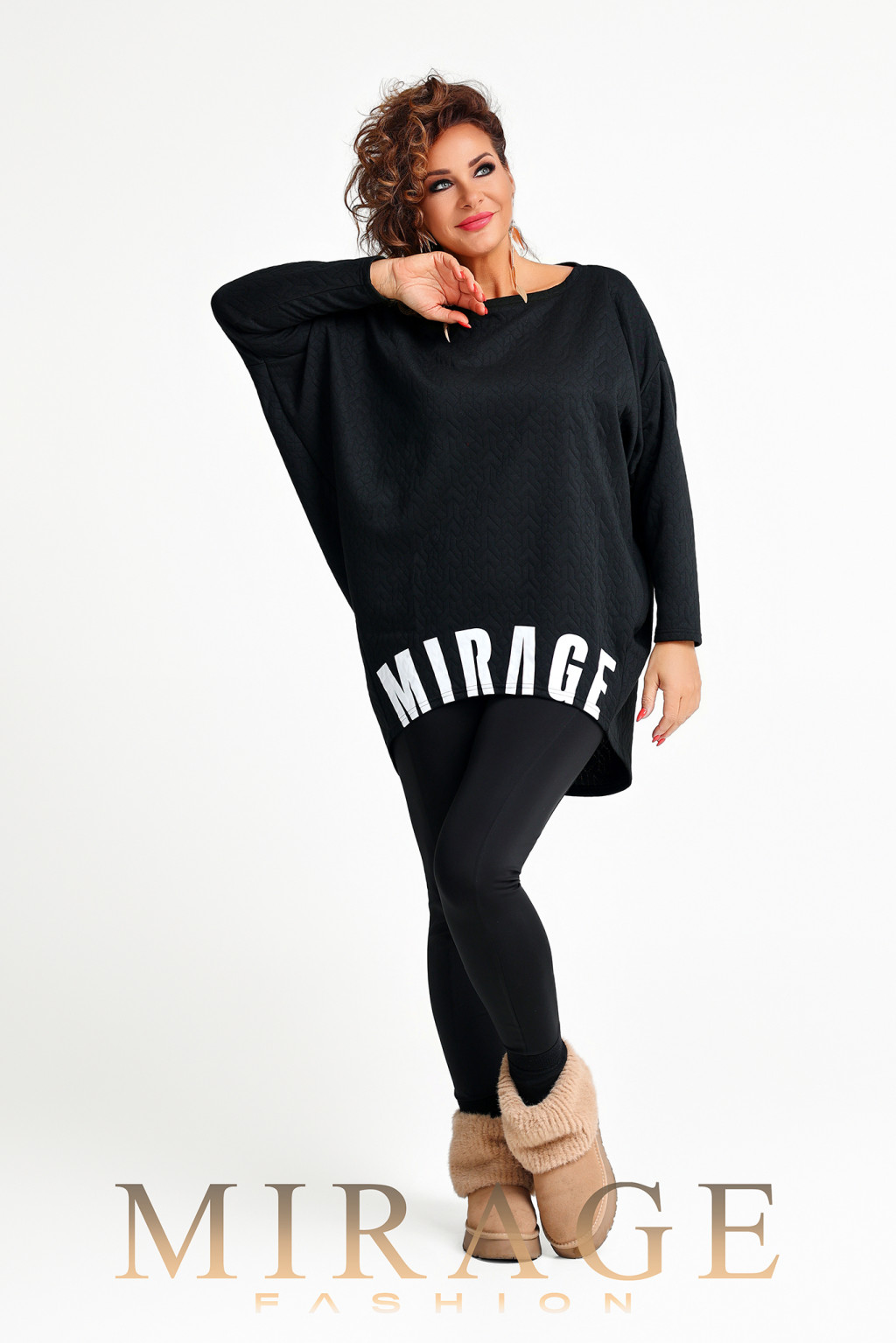 Anyagában fonott mintás, fehér nyomatos, elől rövidebb, hátul hosszabb fazonú, laza, bő tunika.