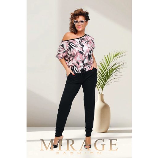 Felül mintás mikró, alul pamut viszkóz anyagból készült, gumis derekú, csónaknyakú overál.