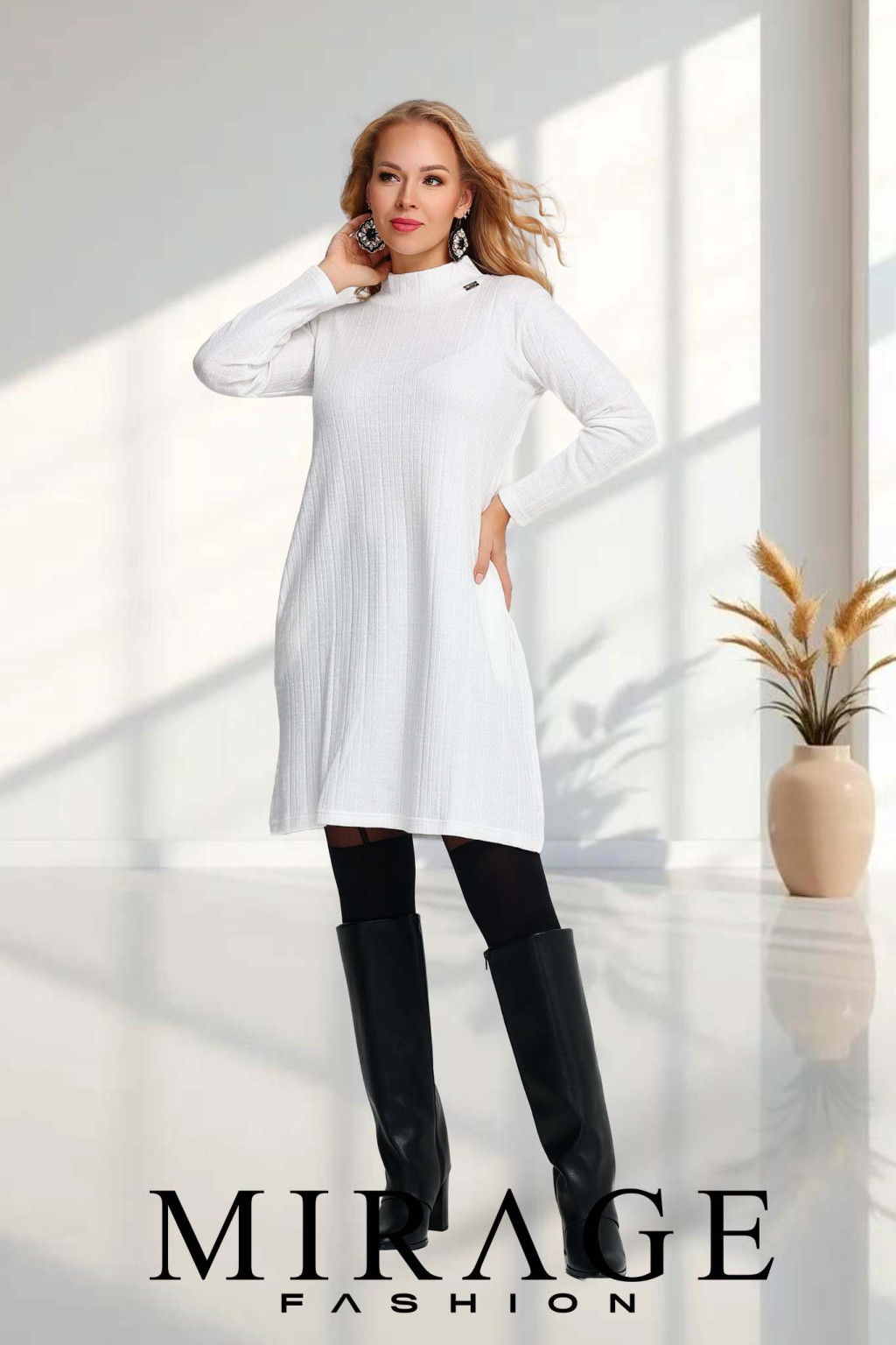 Bordázott kötött anyagból készült, álló nyakú, zsebes ruha.