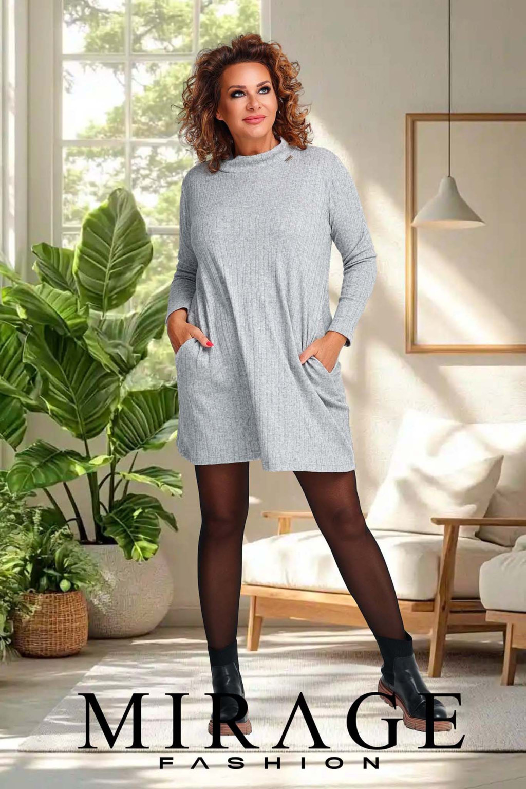 Bordázott kötött anyagból készült, álló nyakú, zsebes ruha.