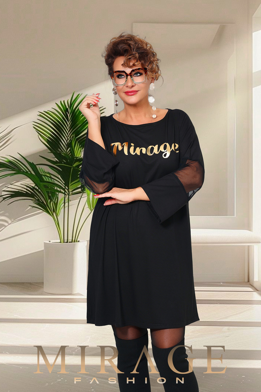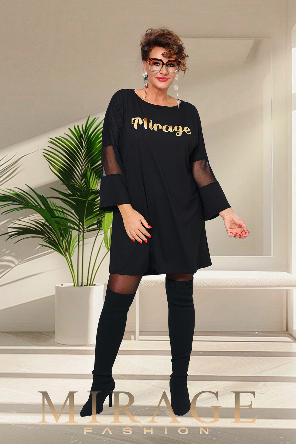 Pamut viszkózból készült, ujjain neccbetétes, tölcsér ujjú, mellnél Mirage feliratos ruha.