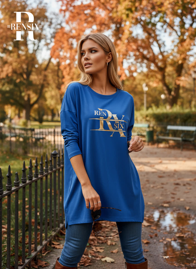 Viszkóz anyagból készült kerek nyakú, elől Rensix nyomatos, bő tunika.