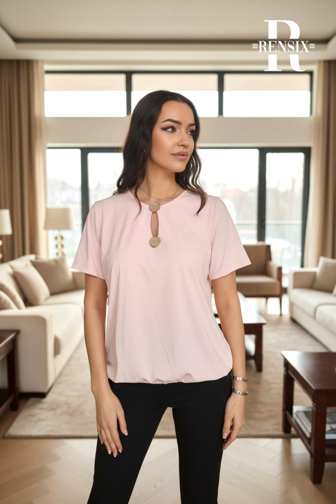 Elasztikus pamut viszkózból készült gumis aljú felső. Mellnél díszgombos és cseppkivágású.