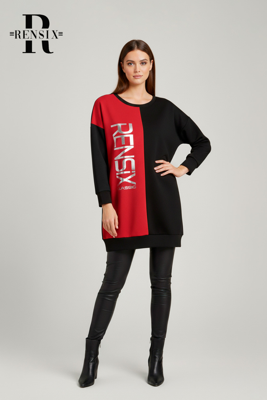 Pihe-puha anyagból készült, fekete alapon, krém betétes (háta fekete) pulcsi tunika.