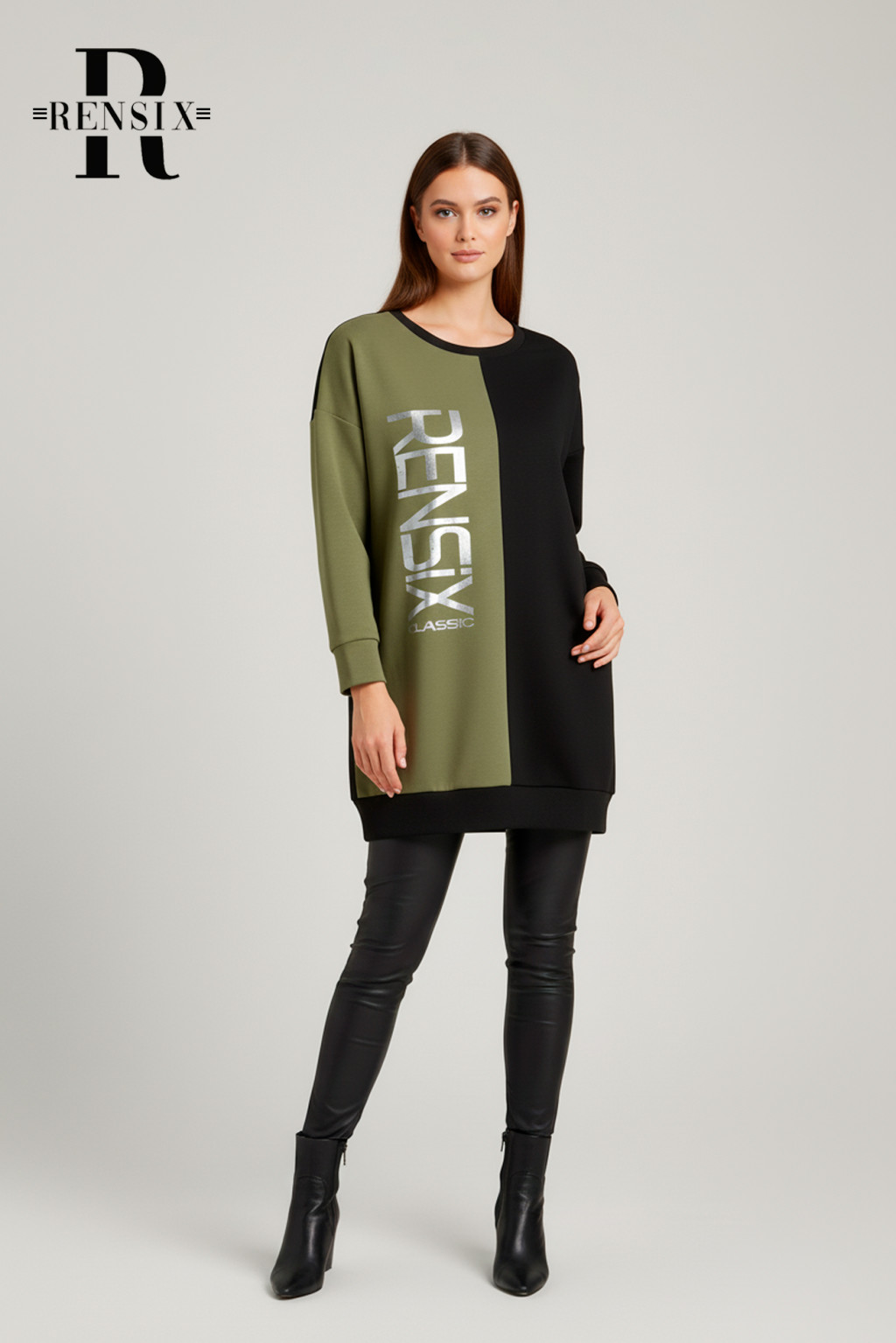 Pihe-puha anyagból készült, fekete alapon, keki betétes (háta fekete) pulcsi tunika.