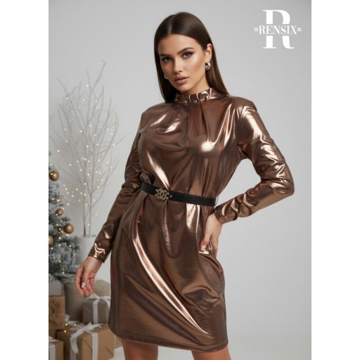 Metál fényű anyagból készült nyakánál ráncolt és díszgombos, öves alkalmi ruha.
