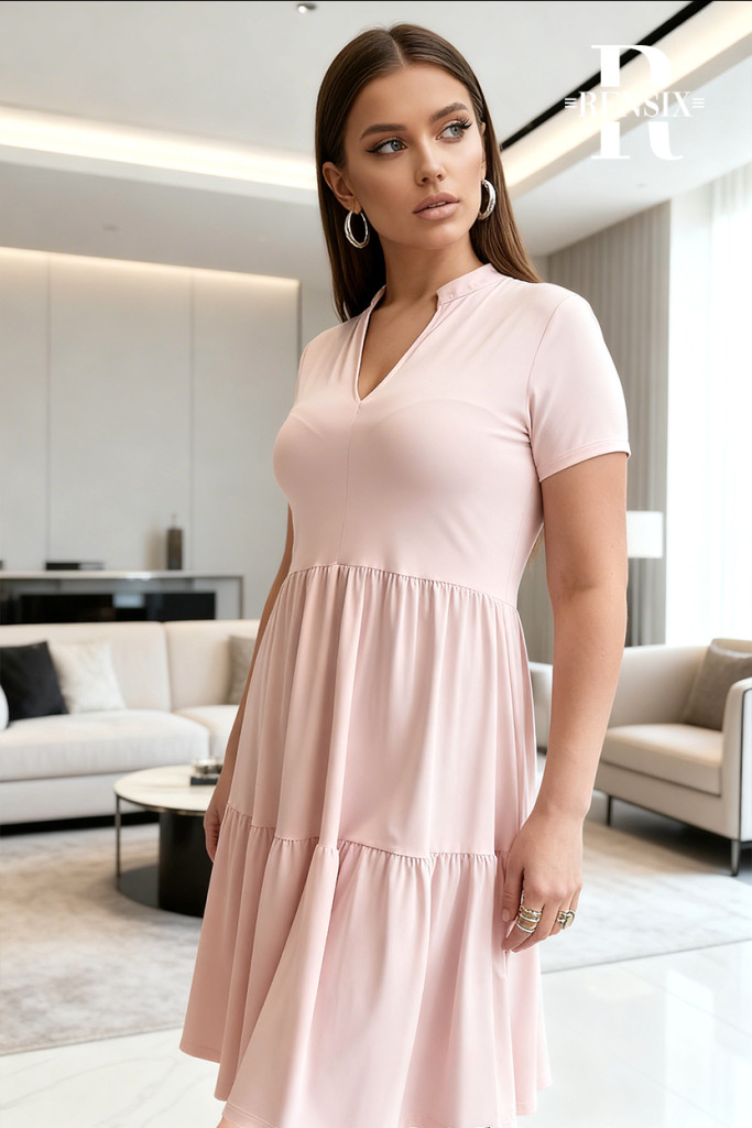 Elasztikus poliamidból készült fodros, nyakánál "V" kivágású, elegáns "A" vonalú ruha,