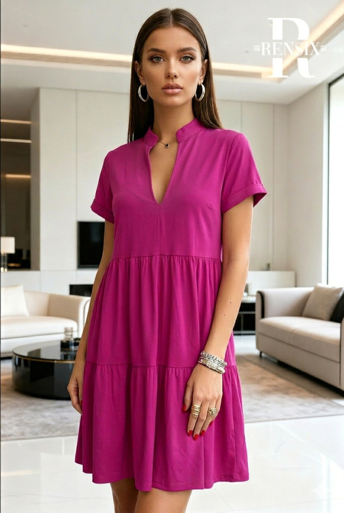 Elasztikus poliamidból készült fodros, nyakánál "V" kivágású, elegáns "A" vonalú ruha,