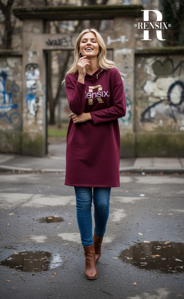 Pamut viszkóz anyagból készült zippes, kapucnis, zsebes, egyenes fazonú pulcsi tunika.