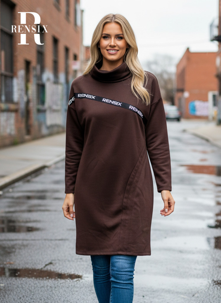 Viszkóz anyagból készült kámzsás nyakú, oldalán húzókás (tetszés szerint állítható) Rensix szalag betétes, enyhén denevér ujjú pulcsi tunika.