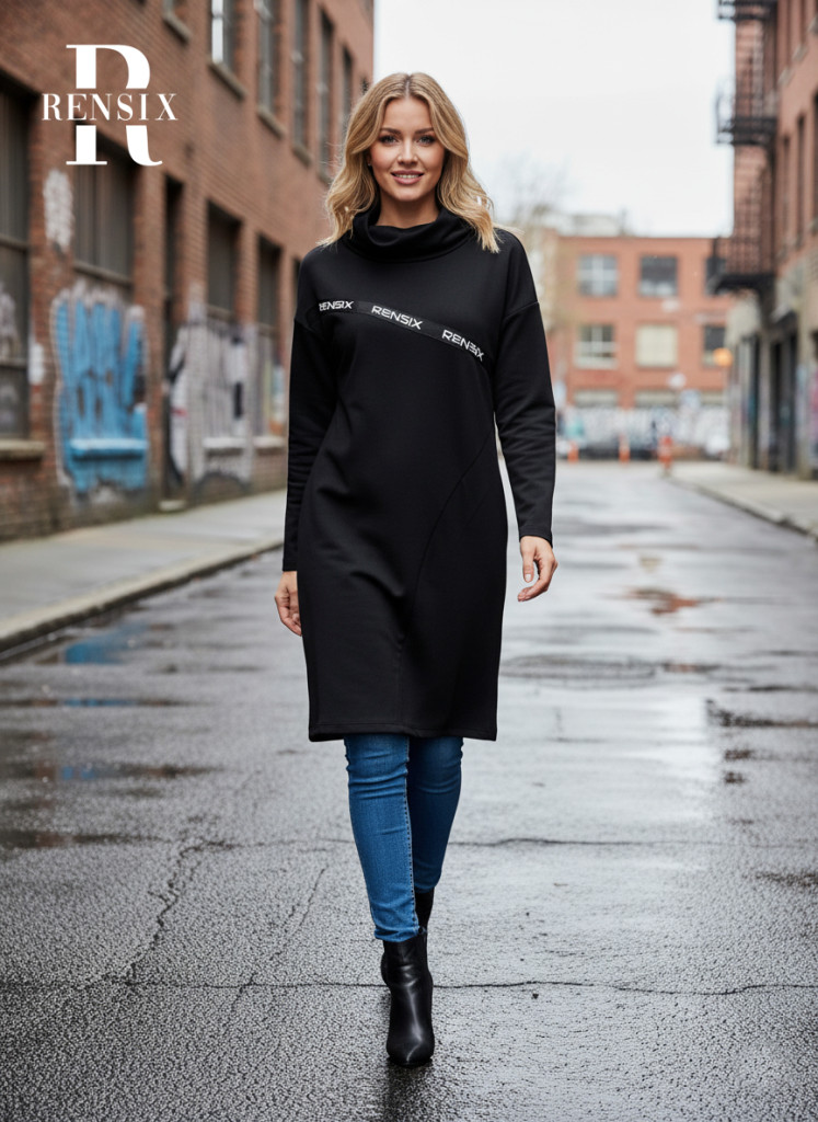 Viszkóz anyagból készült kámzsás nyakú, oldalán húzókás (tetszés szerint állítható) Rensix szalag betétes, enyhén denevér ujjú pulcsi tunika.