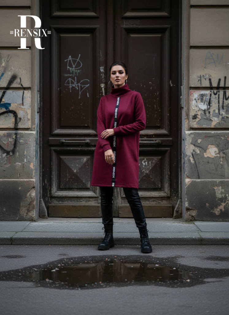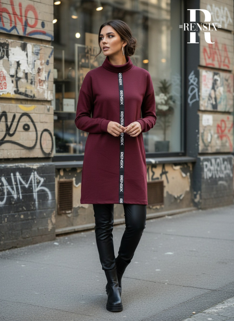 Viszkóz anyagból készült kámzsás nyakú, zsebes, elől Rensix szalag betétes pulcsi tunika.