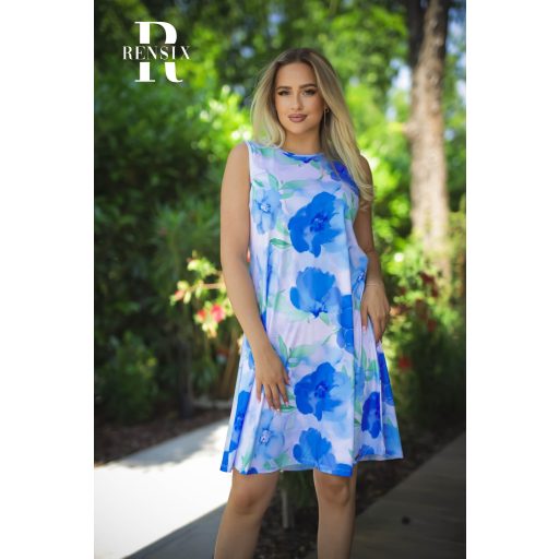 Elől-hátúl mintás poliészterből készült, hátán nyaknál megkötős, A vonalú ruha.