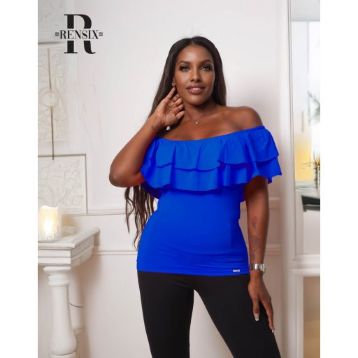 Elasztikus poliamidból készült vállán nagy fodros felső.