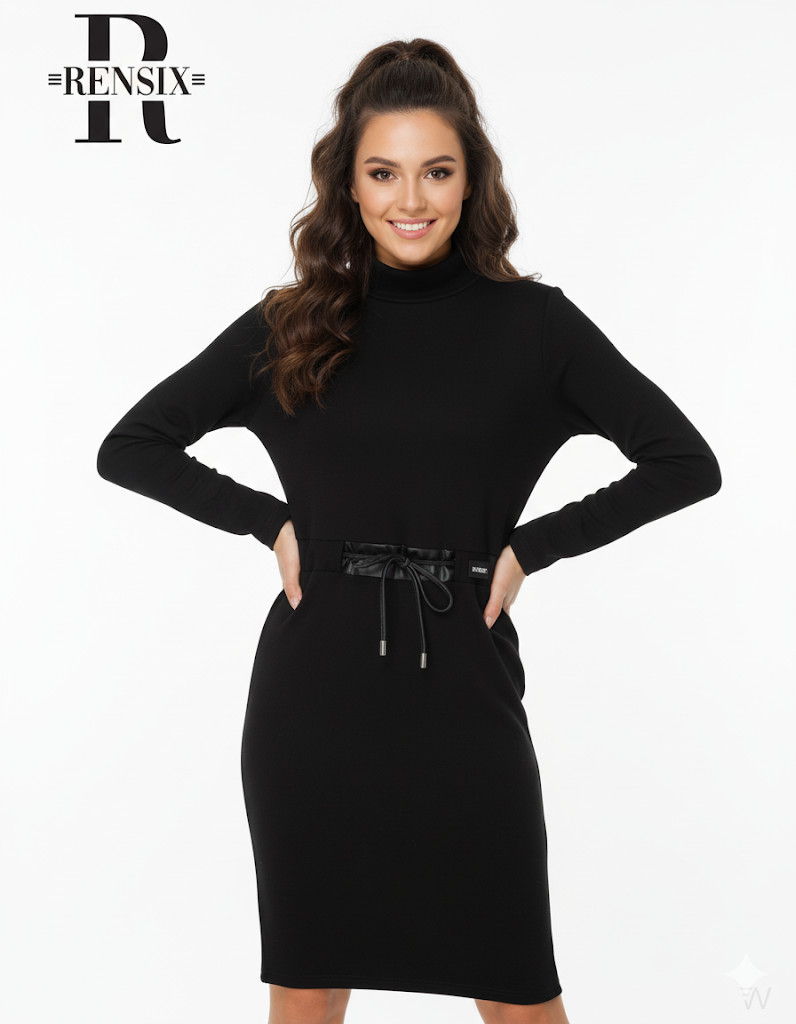 Kötött anyagból készült, garbós nyakú, deréknál bőrbetétes és megkötős ruha.